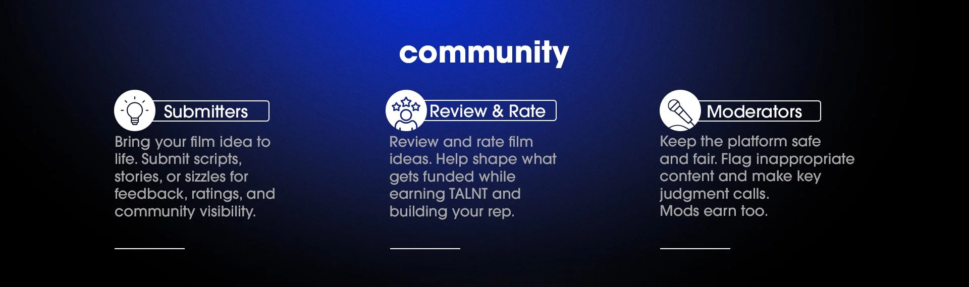 Decentralized Pictures TALNT token is a unique digital currency which is necessary in order to submit projects for consideration by the DCP community. Decentralized Pictures TALNT tokens can be earned by members of our platform who review and evaluate pitches, scripts, and film, television, and other media types of creative ideas or help moderate content, ultimately influencing which projects may be awarded crowdfunded financing and support with arranging for development, production, and distribution.