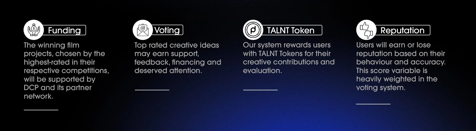 Our platform rewards both film submitters and community participants: filmmakers with funding awards, and participating community members with TALNT tokens (previously FILMCredits), our platform’s currency, which can be used to power future submissions or “staked” to support the TALNT Net, film submission reviews, and or donated film projects.